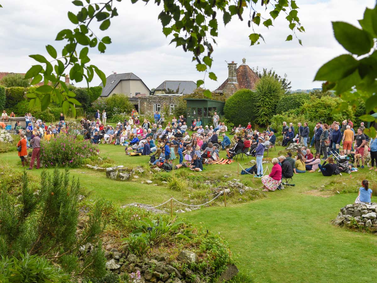 The gravel/lawn performance area with gazebo has room for up to five performers, and the garden an audience capacity of 30 mixed seating/standing. Stunning views over Melbury.