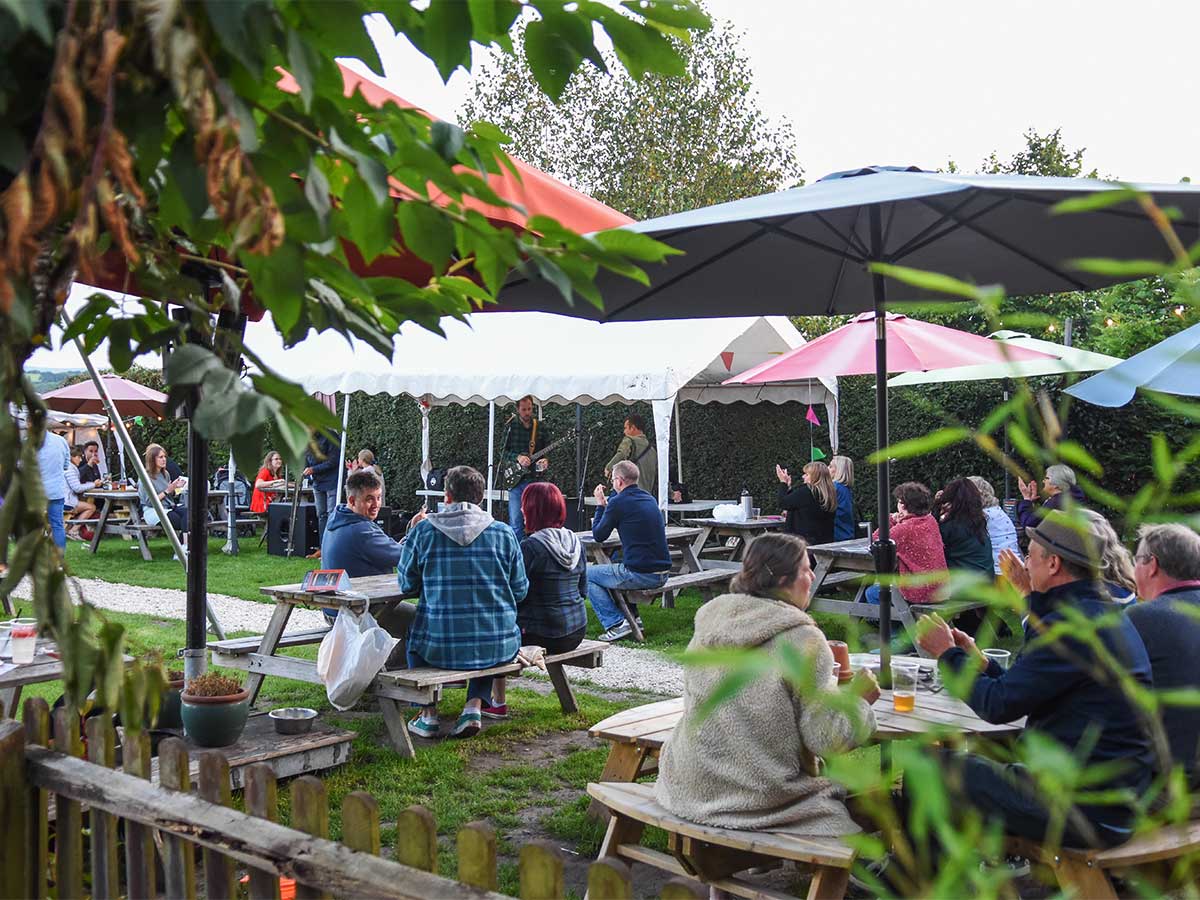 The venue is the rear garden of this local delicatessen, accessed by a wide side door.